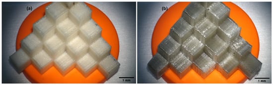 The size of the talc particles is 3–9 μm, however, due to its lamellar structure, where the two SiO4 planes are separated by Mg(OH)2, Van der Waals forces occur at the molecular level. The lamellar structure also reduces the shrinkage effect of the polymer. In addition, although a small processing shrinkage characterizes PC itself at the level of 0.6% to 0.8%, the addition of talc additionally improves the dimensional stability [], which will be beneficial for the created composite models.