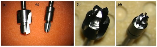 (a,c) Widening drill (depth 4 mm and diameter 4.1 mm) with countersink (depth 0.5 mm and diameter 5.5 mm). (b,d) Conical guide drill (depth 3 + 4 mm and diameter 3.1 mm), which is described in detail in patent []. All drills are made of hardened stainless steel (WS 1.4197). Pictures taken with the Carl ZEISS Vario700 microscope, 6.5× magnification; focal length 225–235 mm.