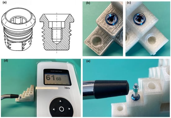 (a) Self-tapping VXI300 implant and VXI300 implant cross-section, where a characteristic thread can be seen []. (b) VXI300 implant mounted in a dry model (700 g PC/5 g PO/3.5 g talc). (c) VXI300 Implant mounted in an undried model (700 g PC/5 g PO/3.5 g talc). (d) Measurement system: Ostelle ISQ provided by Osstell with a magnetic handpiece and SmertPeg type 30 embedded in Cochlear VI300 implant. (e) Magnification: VXI300 implant embedded in test material with SmartPeg type 30 temporarily inserted.
