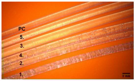 Pictures of the obtained filaments under the Carl ZEISS Vario700 microscope, 19 × magnification. Material in the order counting from the top No. 0-PC, subsequent filament numbers: 1–5, according to the composition from Table 1, filament diameter 1.75 mm.
