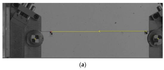 The difference in deformation measurements between the two methods seen in Figure 9 is not due to a scaling error but to triple winding of the thread ends on both sides on the rollers and in no case to the DIC measurement error. The DIC measurement error is in the tenths of a millimeter, hundredths of a pixel and is due to the quality of the markers and lighting. The measuring length of 250 mm, which was introduced when measuring the deformation from the machine head displacement, did not take into account the work of the ends of the cords wound on the rollers, what effected with the overestimated deformation and the noted difference.