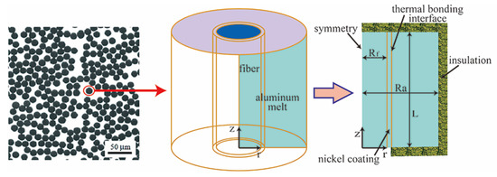 The conventional fiber preforms are made up of a large number of similar fiber units, as shown in Figure 1. For simplicity, a unit-cell of a cylindrical shape with a fiber and alumina melt is extracted as the calculation domain. Figure 1 presents the 3D-axisymmetric carbon fiber/aluminum model, in which the carbon fiber is located in the center and is wrapped in the aluminum melt. The physical model comes from the reference of Nguyen et al. [17,30]. This model assumes that a carbon fiber with or without coating is vertically oriented in the center and is surrounded by the Al alloy melt. Based on this model, this article discusses the temperature field and the thermal stresses and investigates the grain microstructure evolution, including the nucleation and growth process around the fiber and the trend of heat flux. The values of 1, 1, 0.2, and 0.05 units are set for radius (Ra), height (L), carbon fiber radius (Rf), and coating thickness parameters, respectively.