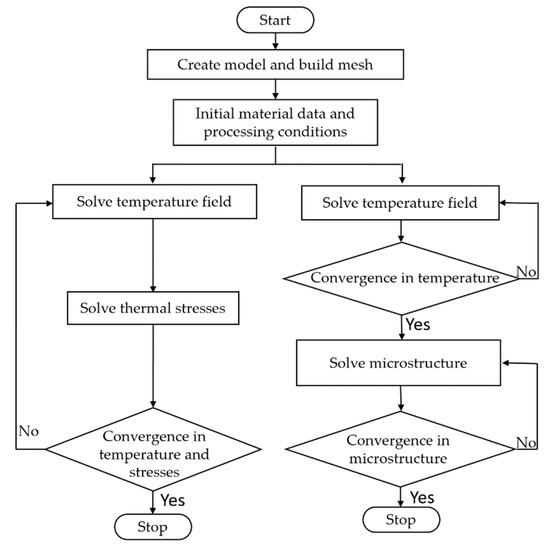 The flow charts of the numerical solution procedure developed for this simulation are shown in Figure 2. The present study is proposed to compute changes in the temperature and thermal stress fields with time and to determine the microstructure evolution during the solidification process of the Al alloy considered. The thermal stress simulation and thermal grain structure simulation are calculated using the commercial software ProCast in our study. The solution domain is discretized into 174,661 nodes, the mesh grid size is about , and the conservation equations are solved at each node of the elements. Such a procedure is repeated iteratively until convergence to the correct solution is obtained. The minimum time-step is about 0.001 s, and the convergence criteria for energy equation is 10−6. During the presentation of the results, some variables involved in the governing equations are rendered dimensionless, including geometry, temperature, and time equations [17,30]: