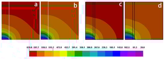 Temperature profile in axial section of the model without coating (a,b) and with coating (c,d) at different dimensionless times (a,c) Fo = 0.156, (b,d) Fo = 0.234.