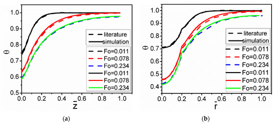 Comparison of the results from the present simulation with that reported in the literature [30] on the evolution of temperature without the nickel coating: (a) = 0.25, (b) = 0.1.