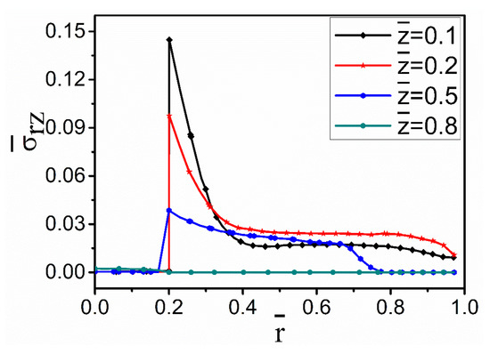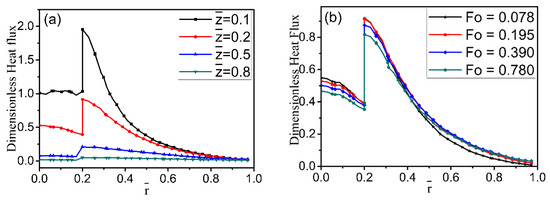 Dimensionless heat flux as a function of radial location is studied for four axial-location cases and different time cases in Figure 5. It can be seen that the heat flux within the fiber changes little along the radial direction, but the heat flux in the melt declines sharply. There is a discontinuity in the heat flux profile due to a sharp change in the thermal properties across the fiber and melt interface. It is a potential site for stress concentration. Figure 5a also illustrates that the heat flux has an obvious decreasing trend away from the cooling end along the z-direction. Figure 5b shows the changes in the nondimensional heat flux along the axial (z) direction at the different time instances. In Figure 6, the heat flux obviously decreases along the axial direction as the radial distance increases from r = 0.19 to r = 0.26. However, there are differences in the two figures, because r = 0.19 is located inside the fiber and is near the cold fiber-end, while r = 0.26 is located in the melt. Inside the fiber, the decline in heat flux is much steeper than that in the melt, which may be attributed to differences in thermal conductivity in the two regions (Table 1).