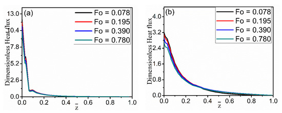 Changes in the dimensionless heat flux (without the nickel coating) along the fiber-axis direction at (a) = 0.19, (b) = 0.26.
