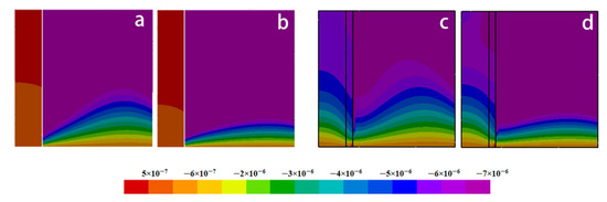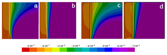 Distributions of axial deformation: (a) Fo = 0.156, without coating; (b) Fo = 0.234, without coating; (c) Fo = 0.156, with coating; (d) Fo = 0.234, with coating.
