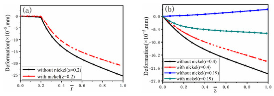 Figure 12 describes in detail comparison between the distributions of deformation with and without nickel coating. It can be found that the deformation displacement of the model with nickel coating is smaller than that without coating in the radial direction at = 0.2. At the same time, there is little change in displacement at the fiber side. Figure 12b, = 0.19 reveals a completely different deformation of the model with and without nickel coating. The main reason is the different thermal expansion coefficient values for fiber, coating, and melt. The carbon fiber shows volume expansion with decreasing temperature, while the volume shrinks due to the positive thermal expansion coefficient of nickel coating and melt. In addition, the absolute value of the thermal expansion coefficient of the melt and the nickel coating is far greater than that of the fiber. So, the expansion process of the fiber is blocked and forced to move in the opposite direction during the cooling process. Figure 12b, = 0.4 presents that the deformation displacement of the model with nickel coating is smaller than without coating.
