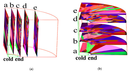 Microstructure predicted at the different sections: (a) axial sections, (b) radial sections.