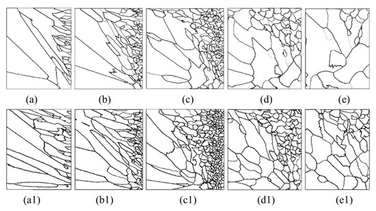 Figure 13 shows a series of axial and radial slices of grain microstructure predicted. Figure 13, Figure 14 and Figure 15 present the simulation results of the grain microstructure profile of axial directions with and without coating under different cooling conditions. The higher temperature gradient is obviously affecting the microstructure close to the cold end. The grain growth near the nucleation surface is restrained and forms finer equiaxial crystals due to chilling. However, grains tend to form coarse columnar crystals away from the chilling layer, as shown in Figure 14(a–c,a1–c1) and Figure 15(a–c,a1–c1). The microstructure away from the fiber tends to form coarse equiaxed grains due to the lower thermal gradient away from the cold end, as shown in Figure 14(d,e,d1,e1) and Figure 15(d,e,d1,e1). Compared to the simulated results with and without nickel coating, it can be found from Figure 14(e,e1) and Figure 15(e,e1) that the number of grains increases significantly in the presence of the nickel coating away from the fiber. The size of grains also reduces relatively, as observed in Figure 14 and Figure 15. The main feature is that the nickel coating can act as a thermal resistance layer, making the temperature profiles near interfaces uniform and further reducing the temperature gradient, obtaining the fine grain structure. Similarly, this argument can be demonstrated in Figure 16. A close observation of Figure 16 reveals that as the location of the slice is far away from the carbon fiber (from (a) to (e)), the number of grains firstly increases and then decreases, the mean surface of grain firstly decreases and then increases. Moreover, it can be seen that there is a small difference in the number of grains and the average grain area at different cooling temperatures.