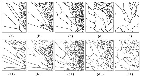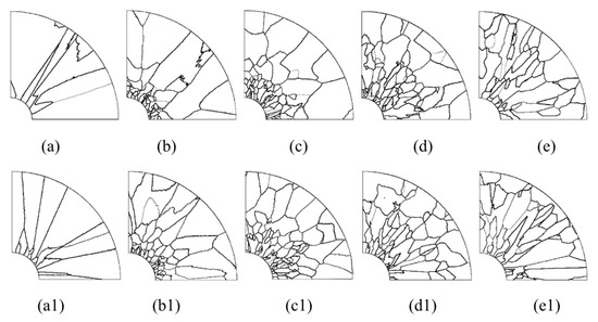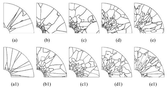 Microstructure morphology predicted of different radial sections with the cooling temperature of 25 °C (a–e) without nickel coating; (a1–e1) with nickel coating.