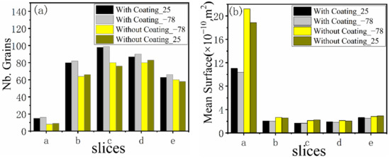 Comparing the simulated microstructure of radial section with and without coating shows that the number of grains increases significantly, and the grains’ mean surface slightly decreases when using the nickel coating, which can be proved via Figure 19. Furthermore, Figure 19 also shows that the number of grains increases firstly and then decreases, and the mean surface presents the opposite trend with the increasing distance from the cold end. In conclusion, the microstructure is obviously refined, which is beneficial for improving the properties of metal matrix composites when the fiber is wrapped with nickel coating and the extended fiber cooling method.