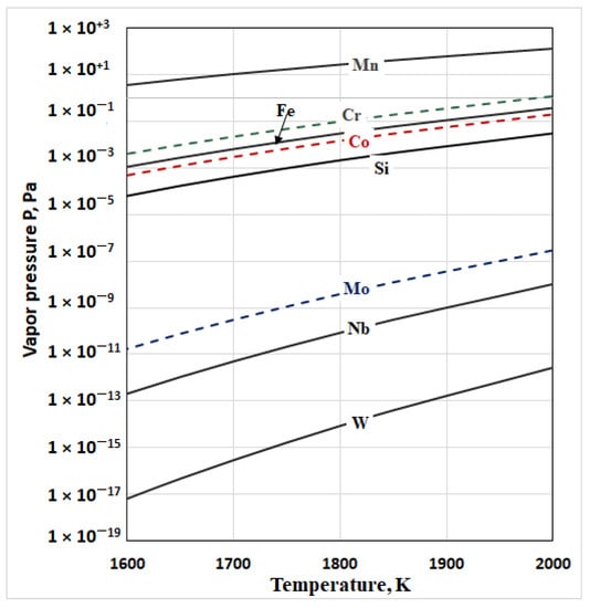 - Within the studied temperature range (1600–2000 K), it is most likely to have evaporation of Mn and Fe. Tungsten and niobium have significantly lower vapor pressures than Co, Cr, and Mo and cannot be removed from the alloy. Si has a vapor pressure close to that of Co and its evaporation is thermodynamically probable, but it will be difficult. Out of the main components of the alloy, the probability of evaporation of Cr is the highest.