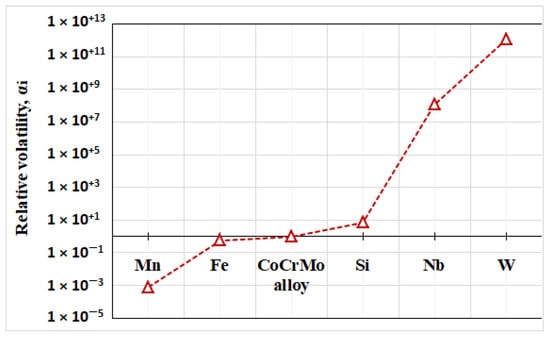 The values of the relative volatility αi of the metal elements in relation to the CoCrMo alloy at T = 1860 K were calculated using Equation (1) and are shown in Figure 3.