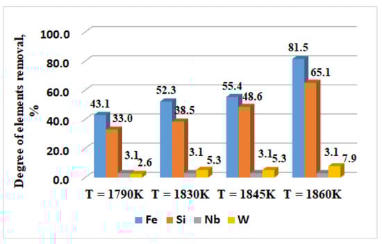 The influence of the temperature in the range from 1790 K to 1860 K at a retention time τ = 20 min on the degree of removal of the elements Fe, Si, Nb, and W is presented in Figure 4. The degree of refining (βi) is calculated using the equation: