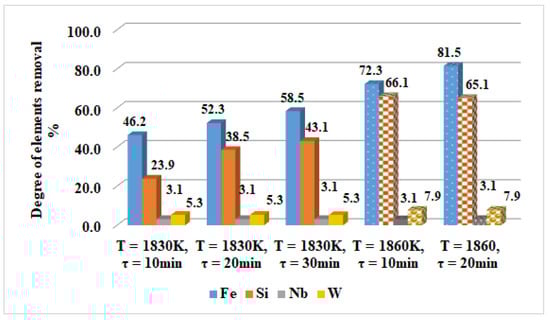 The analysis of the results obtained indicates that the Fe and Si removal degree is constantly increasing with the increase in the temperature and at a maximum operating temperature (T = 1860 K, τ = 20 min) reaches 81.5% and 65.1%, respectively (Figure 4). With an extension of the retention time over 20 min, especially at a lower temperature (1830 K), the removal degree of the two elements changes negligibly. At a higher temperature and an extension of the retention time from 10 min to 20 min, the removal rate of iron (βFe) is increased by about 9% and hardly influences that of silicon (Figure 5). With regard to the more non-volatile elements such as Nb and W, the degree of removal is average ~3% for niobium and ~6% for W. Therefore, these elements cannot be refined by evaporation even at the highest temperature and extension of the melting time.