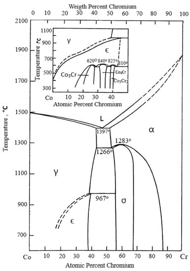 Figure 6 shows the Co–Cr phase equilibrium diagram. At a Cr content of ~31%, the solidification of the alloy starts approximately at a temperature of 1670 K, avoiding the eutectic transition [31,32,33]. The high temperature γ-phase with a face-centered cubic (FCC) grid, which is stable up to ~1223 K, solidifies directly from the liquid. After that the martensitic transformation of the γ-phase starts up to a low temperature hexagonal close-packed (HCP) ε-phase. There is a eutectoid decomposition of the ε-phase → Co3Cr + Co2Cr at lower temperatures. At a higher concentration of Cr, the decomposition takes place along the reaction: ε-phase → Co2Cr + Co3Cr2.