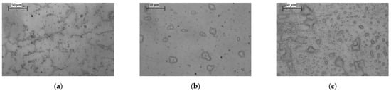 Microstructures of CoCrMo specimens manufactured at T = 1830 K for different refining time: (a) τ = 10 min; (b) τ = 20 min; and (c) τ = 30 min (400× magnification).
