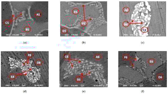 Figure 10 and Figure 11 show SEM/BEC images of the microstructure and the more characteristic intermetallic phases formed in the CoCrMo alloy after EBM at temperatures of 1830 K and 1860 K and retention time τ = 20 min. At a temperature of 1830 K, an experiment with a residence time of 30 min was performed (sample Co-08). The calculated values of the average chemical compositions of the phases observed on the SEM/BEC photographs are given in Table 6.