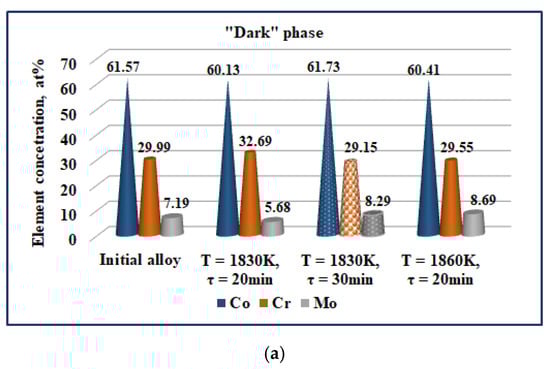 The analysis of the results shows that as the temperature and retention time increase, the alloy is enriched in cobalt from 61% to 64.94%. The content of chromium decreases from 31.22% to 28.79%, and that of molybdenum slightly increases—from 4.78% to 5.06%. This can be explained keeping in mind that the vapor pressure of chromium is higher than that of cobalt, while the vapor pressure of molybdenum is much lower than that of Co and Cr (Figure 2).