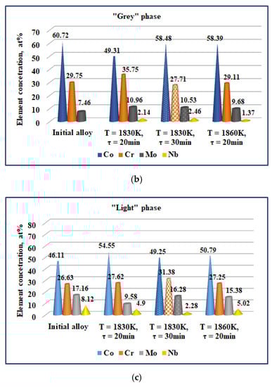 The EDS analysis shows a distinct micro-segregation in the cobalt matrix composition. At a temperature higher than 1830 K in the inter-dendrite zone (“dark”), a Co1.8Cr(Mo,Si) phase is formed. It is close in composition to the Co2Cr phase, which is obtained after the decomposition of the ε-phase (Figure 6). The Co content of this phase is ~60 at% and does not change with an increase in temperature, while the Cr content decreases from ~33 at% to approximately 29 at% (Figure 12a). By increasing the temperature, the melt is enriched in Mo by ~3 at%. W is not present in this phase and the Nb content is less than 0.1 at%.