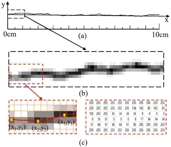 In the current study [38,39], the specimen with structural plane was made by pouring on one side of the structural plane first, and then pouring on the other half after solidification. To make specimens with more realistic structural planes, in this paper, the roughness contour was digitalized by the gray image-processing method. In shooting and calculation, gray digital images will carry a lot of information. Each pixel in the image constitutes a sample. These kinds of images, called black-and-white images, consist only of gray shadows, taking Barton’s standard JRC profile with the value of 12–14 as an example (Figure 1a). Figure 1b shows the basic gray image of the 1 cm of this JRC curve. The built-in function of MATLAB can divide the gray image into a pixel grid as shown in Figure 1c. The part shown contains 160 pixels, with a width of 11 pixels and a height of 6 pixels. Each pixel can be represented by a value from 0 to 255. The grayer the pixel, the lower the gray value.