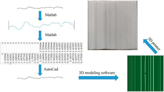 According to the above principles, the coordinates (xu, yu) of points on the JRC profile could be output every 1 mm interval length through MATLAB, and a 3D model was drawn by 3D modeling software according to the extracted coordinate point data. Finally, a 3D printer was used to print it as resin plates recorded with different JRC (the center of the resin plate contains a prefabricated hole with a diameter of 3 mm for placing the bolt). The size of the resin plate was 100 mm × 100 mm × 30 mm. The realization process of the resin plate is shown in Figure 2
