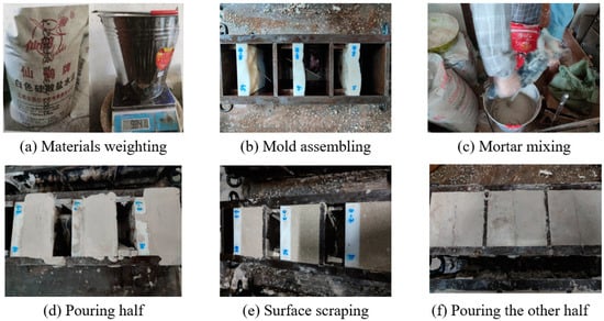 Many scholars have widely used various rock-like materials [35,36,37] to develop experimental research, and their findings have been recognized. In order to study the mechanical behavior of the anchored structural plane under direct shear, cement mortar was adopted to fabricate specimens with structural plane of different JRC. The mass ratio of cement mortar is cement:sand:water = 1.5:0.8:0.6. Ninety mm of full thread rod with the material of 304 steel was selected to simulate the bolt, whose yield strength σy = 205 MPa and elastic modulus E = 199 GPa.