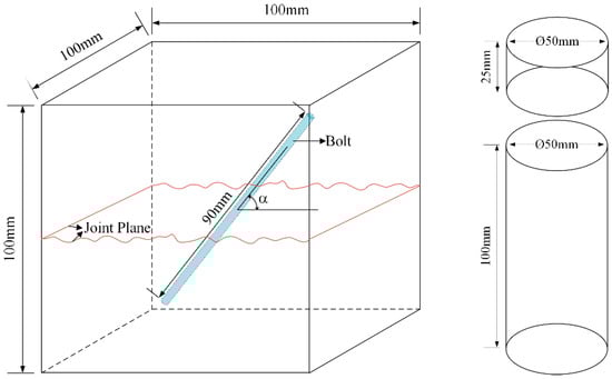 The fabrication process of specimens with structural planes with different JRC is shown in Figure 3. When making unanchored specimens, the resin plate was first placed in the middle of the steel mold, and an appropriate pad was placed on the back of the resin plate to prevent it from deviating when pouring cement mortar. After that, the cement mortar was poured into one side of the mold. After 24 h, we removed the resin plate, brushed a layer of oil on the structural plane, and poured cement mortar into the other half of the steel mold, and then demolded after 1 day. All specimens were cured at constant temperature and humidity for 28 days. The manufacturing and curing process of anchored specimens is completely consistent with that of unanchored specimens except that the bolt needs to be fixed in the resin plate first. In this paper, the anchorage angle α was defined as the angle between the bolt and shear direction. α was 30°, 45°, 60°, 90°, and the number of bolts was 1, which was arranged in the center of the structural plane. The size of the specimen was 100 mm × 100 mm × 100 mm, and the geometric diagram of specimen is shown in Figure 4. Each specimen was assigned an ID, DS-ab-α-σ, where DS represents direct shear experiment, ab represents the range of JRC, α means the anchorage angle, and σ means the normal stress, which were 2 MPa, 3 MPa, 4 MPa, and 5 MPa respectively. According to the recommendation of ISRM [40,41], a batch of 50 mm × 50 mm and 50 mm × 100 mm standard specimens were fabricated.