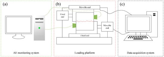 The arrangement of experimental devices. (a) AE monitoring system (b) Loading platform (c) Data acquisition system.