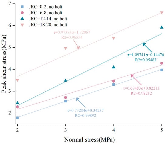 The peak shear strength of unanchored structural planes under different normal stresses were linearly fitted, and the relationship between peak shear stress of structural plane with different JRC and normal stress was obtained, as shown in Figure 7. It can be found that the regression coefficient R2 after linearly fitting were all greater than 0.95, indicating that the imitative effect is good and performs a reliable law. Cohesion-like stress and friction angle of the structural plane were calculated by using the Mohr–Coulomb criterion, as shown in Table 2. From Figure 7, under the same normal stress, the peak shear strength of unanchored structural plane increased with the increase of JRC, and the cohesion-like stress of unanchored structural planes with different JRC were 0.34 Mpa, 0.82 Mpa, 0.14 MPa, and 1.73 MPa, respectively. Based on the linear fitting parameters in Figure 7, friction angle of structural planes with different JRC could be inverted, which were 36.2°, 34.0°, 47.7°, and 44.2°, respectively. Except for the structural plane with JRC of 12–14, the larger the joint roughness, the larger the cohesion of unanchored structural plane. The roughness of the structural plane with JRC of 12–14 was large, but the cohesion-like stress was the smallest. This is because there existed a relatively large and smooth sawtooth on the structural plane with JRC of 12–14, and sliding is the main cause of specimen failure. The shear strength of the specimen is determined by cohesion and friction angle, which may explain why the cohesion-like stress of the structural plane with JRC of 12–14 was the minimum, but its friction angle was the maximum.