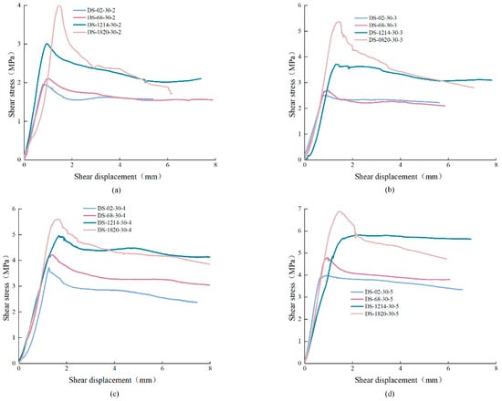 Shear stress-displacement curves of anchored structural planes under different normal stress: (a) σ = 2 MPa, (b) σ = 3 MPa, (c) σ = 4 MPa, (d) σ = 5 Mpa (specimen ID: DS-ab-α-σ, where DS represents direct shear experiment, ab represents the range of JRC, α means the anchorage angle, and σ means the normal stress).
