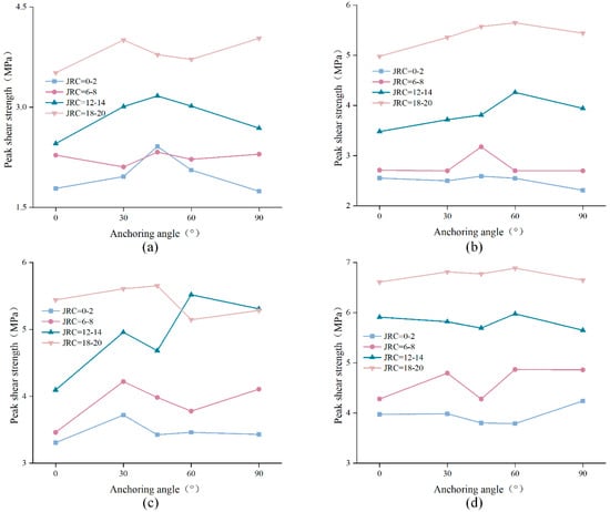 The peak shear strength of the anchored structural plane was classified and drawn according to different normal stress and different JRC, as shown in Figure 10. It is easy to find that no matter how the JRC or normal stress changes, each curve roughly showed a change trend of rising first and then falling. Almost all curves reached the maximum when the anchorage angle was 45° or 60°, that is, the best installation angle of the bolt ranged from 45° to 60°.