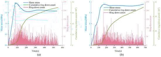 The variation trend of ring-down count and shear stress with time: (a) DS-02-30-2, (b) DS-02-60-5.