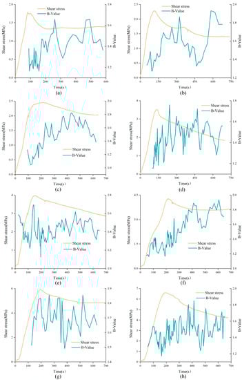 b-value curves of unanchored structural planes with different JRC under shearing: (a) DS-02-0-2, (b) DS-68-0-2, (c) DS-1214-0-2, (d) DS-1820-0-2, (e) DS-02-0-5, (f) DS-68-0-5, (g) DS-1214-0-5, and (h) DS-1820-0-5 (specimen ID: DS-ab-α-σ, where DS represents direct shear experiment, ab represents the range of JRC, α means the anchorage angle, and σ means the normal stress).