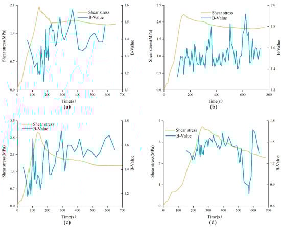 b-value curves of anchored structural planes with different anchorage angles under shearing: (a) DS-02-30-2, (b) DS-02-45-2, (c) DS-02-60-2, and (d) DS-02-90-2 (specimen ID: DS-ab-α-σ, where DS represents direct shear experiment, ab represents the range of JRC, α means the anchorage angle, and σ means the normal stress).