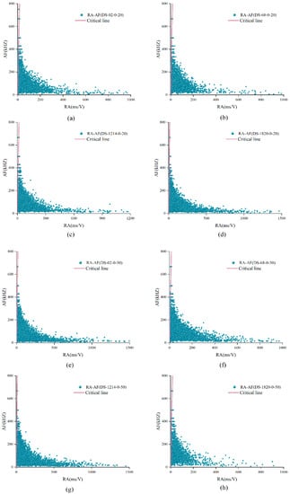 RA-AF distribution of unanchored structural planes. (a) DS-02-0-2 (b) DS-68-0-2 (c) DS-1214-0-2 (d) DS-1820-0-2 (e) DS-02-0-5 (f) DS-68-0-5 (g) DS-1214-0-5 (h) DS-1820-0-5.