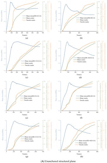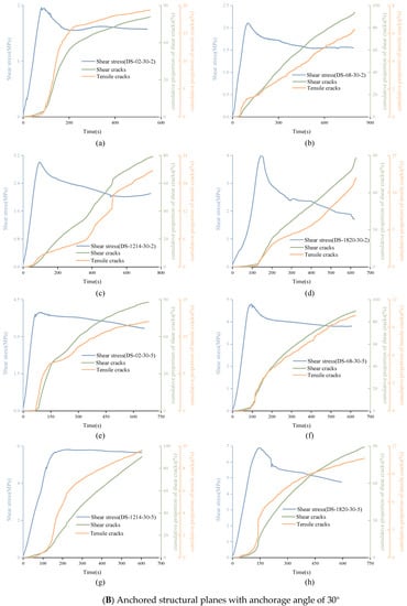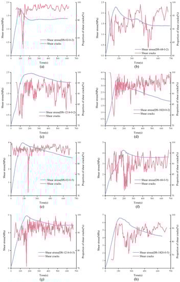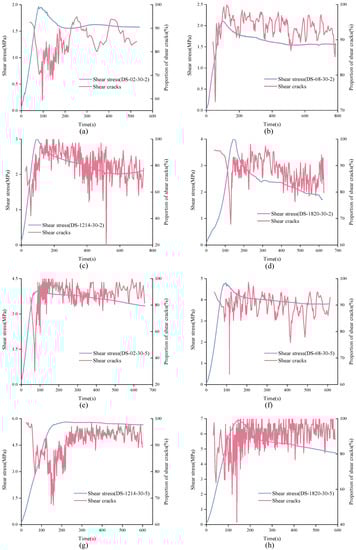 Variation trend of real-time shear cracks’ proportion of anchored structural planes with anchorage angle of 30°. (a) DS-02-30-2 (b) DS-68-30-2 (c) DS-1214-30-2 (d) DS-1820-30-2 (e) DS-02-30-5 (f) DS-68-30-5 (g) DS-1214-30-5 (h) DS-1820-30-5.