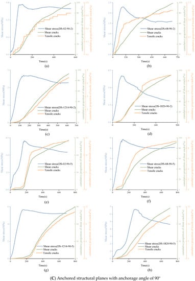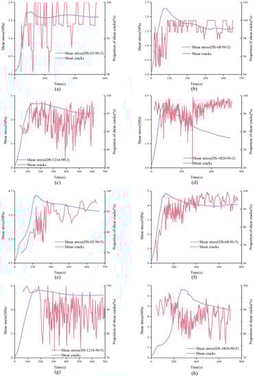 Variation trend of real-time shear cracks’ proportion curves of anchored structural planes with anchorage angle of 90°. (a) DS-02-90-2 (b) DS-68-90-2 (c) DS-1214-90-2 (d) DS-1618-90-2 (e) DS-02-90-5 (f) DS-68-90-5 (g) DS-1214-90-5 (h) DS-1820-90-5.