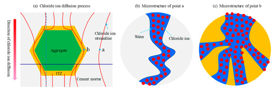 More importantly, the diffusion trajectories of chloride in the concrete meso-structures have been clearly presented in Figure 12. Obviously, the aggregate hinders the diffusion of chloride and increases the diffusion path of chloride. For instance, the chloride ions at point A cannot diffuse through the aggregate to point B along a straight line, but must diffuse around aggregate to point B. Moreover, it is found that the ITZ provides a fast channel for chloride diffusion, as demonstrated in Figure 12b. Consequently, the mechanism of ITZ promoting chloride diffusion in concrete can be well understood by this phenomenon.