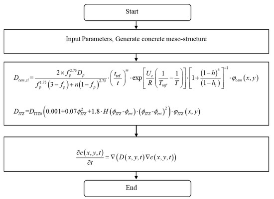 The governing equation of chloride diffusion in concrete is shown in Equation (3). In this paper, the central difference method is used to solve Equation (3). The detailed derivation process of the standardized mathematical formula for this kind of problem is given in the literature [37,40], which would not be repeated here. Figure 3 shows the solution flow chart. Table 1 shows the relevant parameters used in the numerical simulation.
