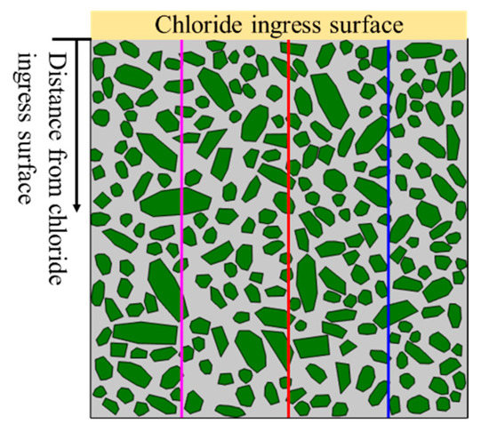 In addition, the thickness of the ITZ is another important factor for the chloride ion diffusion property of concrete. Wu et al. [23] measured the average thickness of the cylindrical-aggregate ITZ by electron microprobe technique and the average thickness of ITZ is about 40.5 μm. Furthermore, Scrivener et al. [23] measured the thickness of the ITZ by SEM technology and find that the thickness distribution of the ITZ is random, ranging from 30 μm to 100 μm, and it has the characteristics of random distribution. Kim et al. [24] also found that the thickness of the ITZ is between 50 μm and 100 μm by analyzing the BSE images. Due to the thickness of ITZ being random and uncontrollable, it is difficult to control the thickness of ITZ by experiment. At present, many scholars use the total volume and surface area of ITZ to characterize the effect of ITZ thickness on chloride diffusion performance. Yang et al. [20] measured the effective chloride diffusion coefficient of concrete by accelerated chloride migration test to study the relationship between the surface area of ITZ and chloride diffusion coefficient. As well, the research shows that with the increase in surface area of ITZ. Zheng et al. [25,26] adopted the concentric circle model and deduced that with the increase of the ITZ thickness, the effective diffusion coefficient of the concrete block also increased. Therefore, the ITZ has a very important influence on the chloride ion diffusion in coagulation.