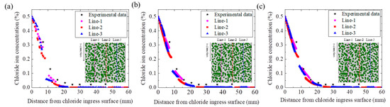 The reliability of the chloride diffusion numerical model proposed in this paper is verified by comparing the experimental data of Fu et al. [41,42] and the numerical simulation results. The values of relevant parameters in the numerical model are listed in Table 2. Moreover, to reduce the influence of randomness of concrete meso-structure, we selected three data lines (e.g., Line-1, Line-2, and Line-3) for comparison, as shown in Figure 4. Figure 5 shows the distribution curve of chloride concentration with depth under the three working conditions (e.g., without ITZ, the ITZ thickness = 50 μm and the ITZ thickness = 100 μm). Obviously, the experimental data are distributed on both sides of the numerical simulation data, and the experimental data are very close to the numerical simulation data. It is indicated that the model proposed in this paper has high reliability. Moreover, the chloride concentration distribution considering the effect of ITZ is in better agreement with the experimental data.
