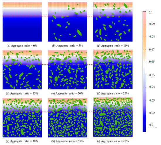 The chloride concentration distribution for different coarse aggregate rat is shown in Figure 6. Obviously, the chloride concentration decreases gradually with the increase of the coarse aggregate ratio. Moreover, compared with the chloride diffusion path of pure cement mortar, the chloride diffusion path is more tortuous with the increase of coarse aggregate ratio. This indicates aggregate hinders chloride diffusion. Furthermore, the histogram of the equivalent chloride diffusion coefficient is demonstrated in Figure 7. However, the effective chloride diffusion coefficient with a 30% coarse aggregate ratio is slightly higher than that with a 25% coarse aggregate ratio. This may be caused by the randomness of concrete aggregate, but the general trend is that the effective diffusion coefficient of concrete decreases with the increase of aggregate ratio, which is consistent with the experimental phenomenon of Yang et al. [43]. In addition, the essential reason for the tortuosity of chloride diffusion is that chloride diffusion needs to bypass the coarse aggregate. Therefore, the tortuosity of chloride diffusion can be reflected by calculating the total perimeter of coarse aggregate. The total perimeter of the aggregate for different coarse aggregate ratios is shown in Figure 8. Obviously, with the increase in coarse aggregate ratio, the total perimeter of coarse aggregate increases. Hence, the chloride diffusion path is more tortuous with the increase of coarse aggregate ratio.