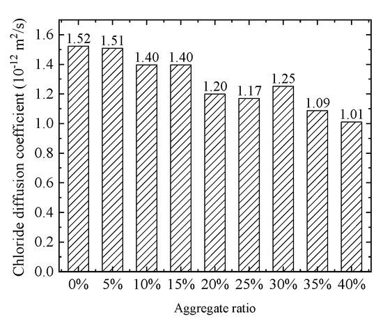 - The coarse aggregate increases the chloride diffusion path and reduces the effective chloride diffusion coefficient in concrete. With the increase in coarse aggregate ratio, the effective chloride diffusion coefficient shows a downward trend. Moreover, coarse aggregate increases the non-uniformity of chloride distribution in concrete, which increases the uncertainty of reinforcement corrosion caused by chloride attack.