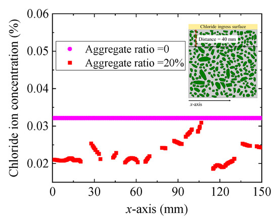 Figure 10 shows the distribution of chloride concentration at 40 mm away from the ingress surface. When the concrete is simplified to a single-phase material (e.g., aggregate ratio = 0), the chloride concentration is the same at the same distance from the chloride ingress surface, as demonstrated in Figure 10. However, when the chloride is regarded as a multiphase composite, the chloride concentration has a great difference at the same distance from the ingress surface, as dominated in Figure 10. For example, when the coarse aggregate ratio is 40%, the average chloride concentration at 40 mm from the chloride ingress surface is 0.027% and the standard deviation is 0.0022%. Therefore, when we study the corrosion of reinforcement caused by chloride ingress, it should be considered the randomness of chloride concentration distribution on the surface of reinforcement. It is a reliable method to analyse the durability failure of reinforced concrete caused by chloride ingress by statistical and probability methods.