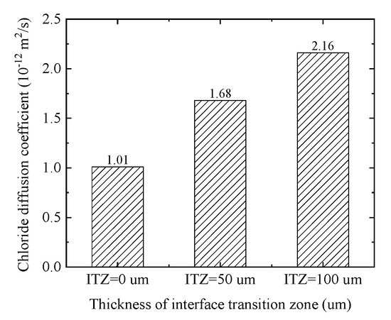 The ITZ thickness is related to cement type, construction technology, curing method, and other factors, and its range is between 20 μm and 100 μm. To quantitatively analyze the influence of the ITZ thickness on the chloride diffusion, the diffusion process of chloride in concrete with different thicknesses of ITZ (i.e., 0 μm, 50 μm, 100 μm) is simulated in this paper. From the equivalent chloride diffusion coefficient histogram as shown in Figure 11, With the increase of the ITZ thickness, the equivalent chloride diffusion coefficient is gradually increasing. Furthermore, the equivalent chloride diffusion coefficients with the ITZ thickness of 50 μm and 100 μm are 65% and 104% higher than that without considering the ITZ effect. Moreover, as can be seen from Figure 11, the ITZ thickness has a linear relationship with the effective chloride diffusion coefficient. Moreover, in the above two cases, the total area of ITZ accounts for only 0.135% and 0.278% of the total area of concrete, respectively. It is indicated that although the area of the ITZ can be ignored, the ITZ has a very important influence on chloride diffusion, and this influence increases gradually with the increase of ITZ thickness.