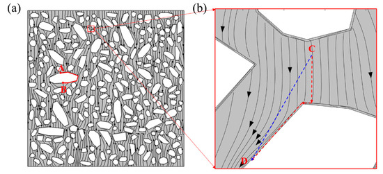 Chloride diffusion trajectories in meso-structures of concrete. (a) Overall concrete section (b) Local amplification.