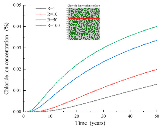 It is worth mentioning that the diffusion characteristic of ITZ is another important factor affecting chloride diffusion behavior. The diffusion characteristics of chloride in the ITZ are related to many factors, such as water-cement ratio, construction technology, curing conditions, cement varieties, and so on. In this paper, the ratio (e.g., R) of the chloride diffusion coefficient in the ITZ to that in the cement mortar phase is used as the index to evaluate the chloride diffusion performance in the ITZ. Obviously, the greater the R value is, the better the chloride diffusion performance is. Figure 13 shows the variation curve of chloride concentration on the reinforcement surface under R = 1/10/50/100. Obviously, with the increase in R value, the chloride concentration is also increasing on the reinforcement surface.